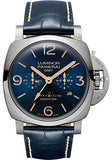 47mm brushed titanium case, sapphire crystal back, polished titanium bezel, blue dial with luminous arabic numerals and hour markers, seconds at 9 o'clock, date and month indicator at 3 o'clock, equation of time indicator at 6 o'clock, P.2002/E calibre hand-wound movement with hours, minutes, small seconds, date, month, equation of time, power reserve indicator on the back, seconds reset, approximately 8 days of power reserve, dark blue alligator strap with beige stitching. Water resistant to 10 bar (~100 metres).