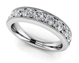 This item features exclusively high-quality natural diamonds, ensuring superior quality and ethical sourcing. For more information about the diamond quality, please do not hesitate to contact us. This vintage diamond anniversary ring comes in various total carat weights, ranging from .34 to 1.53 carats. Each diamond is carefully set in a prong setting and bordered by an elegant millgrain edge design. Customize the perfect diamond anniversary ring today in either gold or platinum and choice of six diamond qualities.