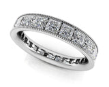 The item exclusively features Lab-Grown Diamonds in FG/VS quality, ensuring premium quality and ethical sourcing. For any inquiries regarding the quality of the stones, please feel free to contact us. Our eternity bands are truly dazzling and make excellent complements to several of our diamond engagement rings. This beautiful ring style features a millgrain edge, a single row of princess cut diamonds, and a prong setting. The eternity design features an endless row of diamonds all around the ring. The ring size affects the number of diamonds on the ring.
