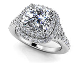 The item exclusively features Lab-Grown Diamonds in FG/VS quality, ensuring premium quality and ethical sourcing. For any inquiries regarding the quality of the stones, please feel free to contact us. This remarkable engagement ring features round side diamonds on the shank that build into the stylish double halo and a cushion cut center diamond. Customize your engagement ring by selecting the metal type, total carat weight, diamond quality and size.