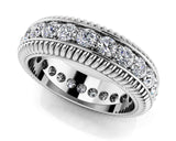 The item exclusively features Lab-Grown Diamonds in FG/VS quality, ensuring premium quality and ethical sourcing. For any inquiries regarding the quality of the stones, please feel free to contact us. This beautiful eternity ring features a combination of diamonds and delightful details. Each diamond is arranged between shared prongs and a stunning rope design. Customize your ring by selecting the metal type, total carat weight, diamond quality and size.