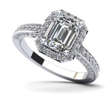 This item features exclusively high-quality natural diamonds, ensuring superior quality and ethical sourcing. For more information about the diamond quality, please do not hesitate to contact us. This beautiful diamond engagement ring features an emerald cut diamond in the center. The diamond is surrounded by brilliant cut round diamonds in a halo design. Additional round diamonds are set along the shank of the ring making it sparkle from every angle. You may customize the ring by selecting the type of metal, diamond quality, and size. "