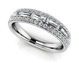 The item exclusively features Lab-Grown Diamonds in FG/VS quality, ensuring premium quality and ethical sourcing. For any inquiries regarding the quality of the stones, please feel free to contact us. Prepare to leave her speechless when you surprise her with this gorgeous anniversary ring. With beautiful baguette diamonds running through a channel and surrounded by round diamonds, this ring is perfect for celebrating another year together. Whether you choose white gold, yellow gold, or platinum this ring will amaze.