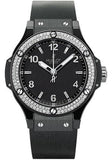 38mm black ceramic case, black ceramic bezel set with 126 diamonds, black dial, quartz movement, black rubber strap with deployant buckle. Water resistant to 100 meters.