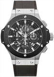 44mm stainless steel case, black ceramic bezel, black skeleton dial, self winding HUB 4214 movement with skeleton chronograph function, black rubber-gummy alligator strap with deployant buckle. Water resistant to 100 meters.