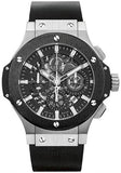 44mm stainless steel case, black ceramic bezel, black skeleton dial, self winding HUB 4214 movement with skeleton chronograph function, black rubber strap with deployant buckle. Water resistant to 100 meters.