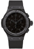 44mm black ceramic case, white gold PVD bezel set with 48 black baguette diamonds (2.80 ct), black composite resin lateral inserts and bezel lugs, black dial with black index hour markers, self winding HUB 4100 movement with chronograph function, approximately 42 hours of power reserve, black rubber strap with deployant buckle. Water resistant to 100 meters.