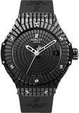 41mm polished black ceramic case, sapphire crystal back, polished black ceramic bezel, black composite resin lateral inserts and bezel lugs, polished black ceramic dial, self winding HUB 1112 movement, approximately 42 hours of power reserve, black rubber strap with deployant buckle. Water resistant to 100 meters.