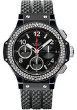 41mm black ceramic case, stainless steel bezel set with 114 diamonds, black dial, self winding HUB 41 movement with chronograph function, approximately 42 hours of power reserve, black rubber strap with deployant buckle. Water resistant to 100 meters.