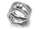 The item exclusively features Lab-Grown Diamonds in FG/VS quality, ensuring premium quality and ethical sourcing. For any inquiries regarding the quality of the stones, please feel free to contact us. This one of a kind design has four gorgeous strands of diamonds interlaced to form a unique wedding and anniversary ring. A beautiful half carat center stone is prong set at the center of these diamond strands. With a total carat weight of 1.2, this ring sparkles from all directions and is a wonderful expression of your dedication to each other. You can customize this lovely ring for yourself in shimmering gold or platinum and choice of diamond qualities.