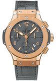 41mm 18k red gold case, 18K red gold bezel, gray composite resin lateral inserts and bezel lugs, tantulum color dial, self winding HUB 4300 movement with chronograph function, approximately 42 hours of power reserve, grey rubber and gummy alligator strap with deployant buckle. Water resistant to 100 meters.