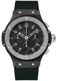 44mm black ceramic case, tungsten bezel, black composite resin lateral inserts and bezel lugs, black dial, self winding HUB 4100 movement with chronograph function, approximately 42 hours of power reserve, black rubber strap with deployant buckle. Water resistant to 100 meters.
