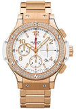 41mm 18K red gold case, 18K red gold bezel set with 114 diamonds, white dial, self winding HUB 4300 movement with chronograph function, approximately 42 hours of power reserve, 18K red gold bracelet. Water resistant to 100 meters.