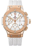 41mm 18k red gold case, 18K red gold bezel, white composite resin lateral inserts and bezel lugs, white dial, self winding HUB 4300 movement with chronograph function, approximately 42 hours of power reserve, white rubber strap with deployant buckle. Water resistant to 100 meters.