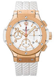 41mm 18K red gold case, 18K red gold bezel, white dial, self winding HUB 41 movement with chronograph function, approximately 42 hours of power reserve, white rubber strap with deployant buckle. Water resistant to 100 meters.