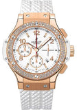 41mm 18K red gold case, 18K red gold bezel set with 114 diamonds, white dial, self winding HUB 41 movement with chronograph function, approximately 42 hours of power reserve, white rubber strap with deployant buckle. Water resistant to 100 meters.