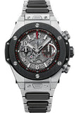 45 mm polished and satin-finished titanium case, satin-finished black ceramic bezel, anodized black aluminum lower bezel with 6 H-shaped titanium screws, sapphire crystal with anti-reflective treatment and Hublot logo printed on the inner side, mat black dial with rhodium-plated upper layer indexes, satin-finished and microblasted rhodium-plated hands, white luminescent on hour markers and hands, HUB1242 UNICO manufacture self-winding chronograph flyback movement with column wheel, approximately 72 hours of power reserve, black rubber and satin-finished titanium and ceramic bracelet, titanium deployant buckle. Water resistant to 100 meters.