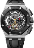 44mm titanium case, 14.45mm thick, glareproofed sapphire crystal back, screw-locked crown and titanium pushpiece guards, black ceramic bezel, glareproofed sapphire crystal, satin-brushed black openworked dial with black counters, white gold applied hour-markers and Royal Oak hands with luminescent coating, black Inner bezel, Calibre 2936 hand-wound movement with tourbillon, chronograph, hours, minutes, small seconds, approximately 72 hours of power reserve, black rubber strap, titanium pin buckle. Water resistant to 100 meters.