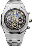 44mm titanium case, 14.80mm thick, sapphire back, screw-locked crown, titanium bezel, sapphire crystal, dial with smoky counters, white gold royal oak hands with luminescent coating, white counter/seconds/split-seconds chronograph hands, black inner bezel with white minute-circle, slate grey movement, caliber 2885 self-winding movement with perpetual calendar indicating the day, the date, the week, the moon phases, the month and the leap years, minute repeater, split-seconds chronograph and small seconds at 9 o'clock, approximately 45 hours of power reserve, titanium bracelet, AP folding buckle. Water resistant to 20 meters.