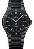 45 mm satin-finished and polished black ceramic case, satin-finished and polished black ceramic bezel with 6 H-shaped titanium screws, sapphire crystal with anti-reflective treatment, mat black dial, HUB1112 self-winding movement with movement, approximately 42 hours of power reserve, polished and satin-finished black ceramic bracelet, black-plated stainless steel deployant buckle. Water resistant to 50 meters.