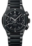 45 mm satin-finished and polished black ceramic case, satin-finished and polished black ceramic bezel with 6 H-shaped titanium screws, sapphire crystal with anti-reflective treatment, mat black dial, HUB1143 self-winding movement with chronograph, approximately 42 hours of power reserve, polished and satin-finished black ceramic bracelet, black-plated stainless steel deployant buckle. Water resistant to 50 meters.