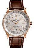 41.0 mm 18K red gold case, 10.0 mm thick, screw-locked crown with two gaskets, beaded bezel, silver dial, Breitling 17 self-winding movement, approximately approx. 38 hrs of power reserve, brown alligator leather strap, tang buckle. Water resistant to 3 bars.