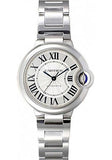 33 mm by 9.96 mm thick stainless steel case, fluted crown set with a synthetic spinel cabochon, sapphire crystal, silver dial with 12 Roman numerals and blued steel hands, caliber Cartier 076 automatic movement, stainless steel bracelet. Water resistant to 30 meters.