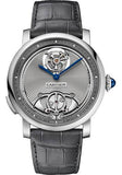 45mm titanium case, 14.7mm thick, sapphire back, beaded crown with a sapphire cabochon, sapphire crystal, silver dial with 18K white gold guilloche and blued-steel sword-shaped hands, caliber 9402 manual movement with minute repeater and flying tourbillon complication with seconds indicated by the C-shaped tourbillon carriage, approximately 50 hours of power reserve, gray alligator skin strap, 18K white gold double adjustable folding buckle. Water resistant to 30 meters.