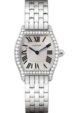 30mm x 24mm 18K rhodium-finish white gold case brilliant-cut diamond, 7.3mm thick, steel back, octagonal crown set with a brilliant-cut diamond, 18K rhodium-finish white gold bezel set with a brilliant-cut diamonds, silver dial with sunray effect flinque, manual-winding movement with sword-shaped hands in blued steel, mineral glass, 18K rhodium-finish white gold bracelet. Water resistant to 30 meters.