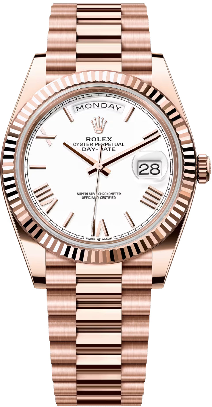 Rolex Day-Date 40 Rose Gold White Roman Dial & Fluted Bezel President Bracelet 228235 -