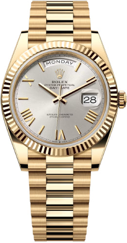 Rolex Day-Date 40 Yellow Gold Silver Roman Dial & Fluted Bezel President Bracelet 228238 -