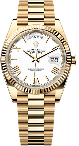 Rolex Day-Date 40 Yellow Gold White Roman Dial & Fluted Bezel President Bracelet 228238 -