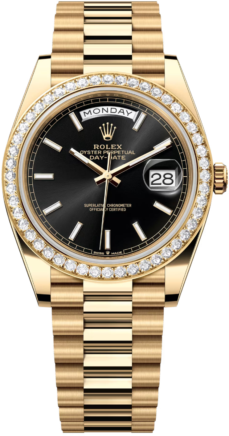 Rolex Day-Date 40 Yellow Gold Black Diagonal Motif Index Dial & Fluted Bezel President Bracelet 228238 -