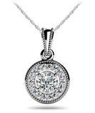 This item features exclusively high-quality natural diamonds, ensuring superior quality and ethical sourcing. For more information about the diamond quality, please do not hesitate to contact us. A lovely prong set diamond is special, and it would be hard to think of a proper way to 'frame' it that would be suitable, but our designers have done it again! They've framed that lovely stone with a fabulous circle of diamonds and the result is truly incredible. This piece gleams & shines from every angle! The total diamond weight is .64 carats, with the center stone, which appears to 'float' in the middle, weighing at a substantial half a carat!