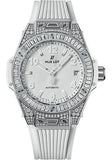 39 mm polished stainless steel case set with 118 diamonds (~0.84ct), polished 18K white gold bezel polished 18k white gold set with 48 baguette-cut diamonds (~1.90cts) and 6 H-shaped titanium screws, sapphire crystal with anti-reflective treatment, mat white dial, HUB1710 self-winding movement, approximately 50 hours of power reserve, white structured lined rubber strap, stainless steel deployant buckle. Water resistant to 100 meters.
