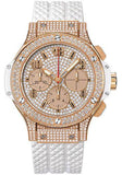 41mm 18k red gold case set with 198 diamonds (0.96ct), 18K red gold bezel set with 114 diamonds (1.22 ct), white composite resin lateral inserts and bezel lugs, pave diamond dial, self winding HUB 4300 movement with chronograph function, approximately 42 hours of power reserve, white rubber strap with deployant buckle. Water resistant to 100 meters.