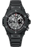 45 mm microblasted black ceramic case, microblasted black ceramic bezel, sapphire crystal with anti-reflective treatment, mat black skeleton dial, HUB 1242 self-winding movement with flyback chronograph and column wheel, approximately 72 hours of power reserve, black microblasted ceramic bracelet, black-plated titanium deployant buckle. Water resistant to 100 m.