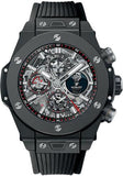 45 mm microblasted and polished black ceramic case, microblasted and polished black ceramic bezel with 6 h-shaped titanium screws and black composite resin lower, sapphire crystal with anti-reflective treatment, sapphire dial, HUB 1270 self-winding perpetual calendar and chronograph movement, approximately 72 hours of power reserve, black lined rubber strap, black-plated titanium deployant buckle. Water resistant to 100 m.