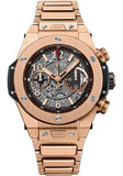 45 mm polished and satin-finished 18K King Gold case, polished and satin-finished 18K King Gold bezel, black composite resin lower bezel with 6 H-shaped titanium screws, sapphire crystal with anti-reflective treatment and Hublot logo printed on the inner side, mat black and gold plated dial with satin-finished indexes, satin-finished and microblasted gold plated hands, white luminescent on hour markers and hands, HUB1242 UNICO manufacture self-winding chronograph flyback movement with column wheel, approximately 72 hours of power reserve, black rubber and satin-finished 18K King Gold bracelet, 18K King Gold deployant buckle. Water resistant to 100 meters.