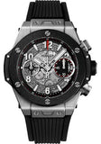 42 mm satin and polished titanium case, satin-finished and polished black ceramic bezel with 6 H-shaped titanium screws, black composite resin lower bezel, sapphire crystal with anti-reflective treatment, mat black skeleton dial, HUB1280 UNICO self-winding movement with flyback chronograph and column wheel, approximately 72 hours of power reserve, black structured lined rubber strap, titanium deployant buckle. Water resistant to 100 meters.