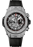 45 mm satin-finished and polished titanium case set with 176 diamonds (~1.18 cts), satin-finished and polished titanium bezel set with 114 diamonds (~1.92 cts), andodized black aluminum lower bezel with 6 H-shaped titanium screws, sapphire crystal with anti-reflective treatment and Hublot logo printed on the inner side, mat black dial with rhodium-plated upper layer indexes, satin-finished and microblasted rhodium-plated hands, white luminescent on hour markers and hands, HUB1242 UNICO manufacture self-winding chronograph flyback movement with column wheel, approximately 72 hours of power reserve, black structured lined rubber strap, titanium deployant buckle with titanium insert. Water resistant to 100 meters.