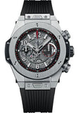 45 mm polished and satin-finished titanium case, polished and satin-finished titanium bezel, anodized black aluminum lower bezel with 6 H-shaped titanium screws, sapphire crystal with anti-reflective treatment and Hublot logo printed on the inner side, mat black dial with rhodium-plated upper layer indexes, satin-finished and microblasted rhodium-plated hands, white luminescent on hour markers and hands, HUB1242 UNICO manufacture self-winding chronograph flyback movement with column wheel, approximately 72 hours of power reserve, black structured lined rubber strap, titanium deployant buckle with titanium insert. Water resistant to 100 meters.