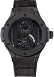 44mm black ceramic case, black ceramic bezel, black dial with two replicas of the column in Place Vendome, manual winding Vendome tourbillon HUB 6003 movement, approximately 5 days of power reserve, black rubber and gummy alligator strap with deployant buckle. Water resistant to 100 meters.
