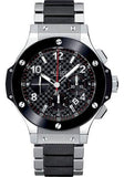 44mm stainless steel case, black ceramic bezel, black carbon dial, self winding HUB 44 movement with chronograph function, approximately 42 hours of power reserve, stainless steel and ceramic bracelet. Water resistant to 100 meters.