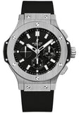 44mm stainless steel case, stainless steel bezel, black dial, self winding HUB 4100 movement with chronograph function, approximately 42 hours of power reserve, black rubber strap with deployant buckle. Water resistant to 100 meters.