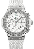 41mm stainless steel case, stainless steel bezel set with 114 diamonds (1.22 ct), white composite resin lateral inserts and bezel lugs, white dial, self winding HUB 4300 movement with chronograph function, approximately 42 hours of power reserve, white rubber strap with deployant buckle. Water resistant to 100 meters.