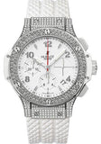 41mm stainless steel case, set with 198 diamonds (0.96 ct) back, stainless steel bezel set with 114 diamonds (1.22 ct), white composite resin lateral inserts and bezel lugs, white dial, self winding HUB 4300 movement with chronograph function, approximately 42 hours of power reserve, white rubber strap with deployant buckle. Water resistant to 100 meters.