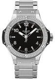 38mm stainless steel case, stainless steel bezel set with 126 diamonds (0.87ct), black composite resin lateral inserts and bezel lugs, black dial, quartz HUB 2900 movement, stainless steel bracelet. Water resistant to 100 meters.
