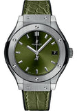 33 mm satin-finished and polished titanium case, satin-finished and polished titanium bezel with 6 H-shaped titanium screws and blue carbon fiber, sapphire crystal with anti-reflective treatment, satin-finished green sunray dial, HUB2912 quartz movement, approximately 3 years of power reserve, green alligator and black rubber strap, stainless steel deployant buckle. Water resistant to 50 meters.