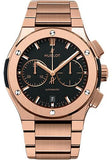 45 mm polished and satin-finished 18K King Gold case, polished and satin-finished 18K King Gold bezel with 6 h-shaped titanium screws, sapphire crystal with anti-reflective treatment, mat black dial, HUB 1143 self-winding chronograph movement, approximately 42 hours of power reserve, satin-finished and polished 18K King Gold bracelet, 18K King Gold deployant buckle. Water resistant to 50 m.